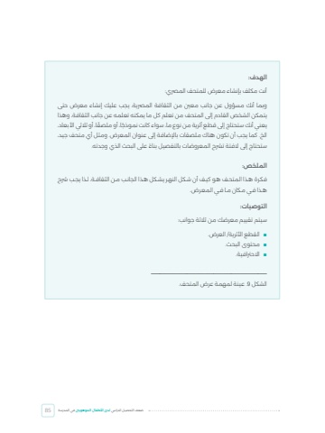 %u0636%u0639%u0641 %u0627%u0644%u062a%u062d%u0635%u064a%u0640%u0644 %u0627%u0644%u062f%u0631%u0627%u0633%u064a %u0644%u062f%u0649 %u0627%u0623%u0644%u0637%u0641%u0627%u0644 %u0627%u0644%u0645%u0648%u0647%u0648%u0628%u0646%u064a %u0641%u064a %u0627%u0644%u0645%u062f%u0631%u0633%u062985%u0627%u0644%u0647%u062f%u0641: %u0623%u0646%u062a %u0645%u0643%u0644%u0641 %u0628%u0625%u0646%u0634%u0627%u0621 %u0645%u0639%u0631%u0636 %u0644%u0644%u0645%u062a%u062d%u0641 %u0627%u0644%u0645%u0631%u0635%u064a:%u0648%u0628%u0645%u0627 %u0623%u0646%u0643 %u0645%u0633%u0624%u0648%u0644 %u0639%u0646 %u062c%u0627%u0646%u0628 %u0645%u0639%u0646%u064a %u0645%u0646 %u0627%u0644%u062b%u0642%u0627%u0641%u0629 %u0627%u0644%u0645%u0631%u0635%u064a%u0629%u060c %u064a%u062c%u0628 %u0639%u0644%u064a%u0643 %u0625%u0646%u0634%u0627%u0621 %u0645%u0639%u0631%u0636 %u062d%u062a%u0649 %u064a%u062a%u0645%u0643%u0646 %u0627%u0644%u0634%u062e%u0635 %u0627%u0644%u0642%u0627%u062f%u0645 %u0625%u0644%u0649 %u0627%u0644%u0645%u062a%u062d%u0641 %u0645%u0646 %u062a%u0639%u0644%u0645 %u0643%u0644 %u0645%u0627 %u064a%u0645%u0643%u0646%u0647 %u062a%u0639%u0644%u0645%u0647 %u0639%u0646 %u062c%u0627%u0646%u0628 %u0627%u0644%u062b%u0642%u0627%u0641%u0629%u060c %u0648%u0647%u0630%u0627 %u064a%u0639%u0646%u064a %u0623%u0646%u0643 %u0633%u062a%u062d%u062a%u0627%u062c %u0625%u0644%u0649 %u0642%u0637%u0639 %u0623%u062b%u0631%u064a%u0629 %u0645%u0646 %u0646%u0648%u0639 %u0645%u0627%u060c %u0633%u0648%u0627%u0621 %u0643%u0627%u0646%u062a %u0646%u0645%u0648%u0630%u064b%u064b%u062c%u0627%u060c %u0623%u0648 %u0645%u0644%u0635%u064b%u064b%u0642%u0627%u060c %u0623%u0648 %u062b%u0627%u0644%u062b%u064a %u0627%u0623%u0644%u0628%u0639%u0627%u062f%u060c %u0627%u0644%u062e. %u0643%u0645%u0627 %u064a%u062c%u0628 %u0623%u0646 %u062a%u0643%u0648%u0646 %u0647%u0646%u0627%u0643 %u0645%u0644%u0635%u0642%u0627%u062a %u0628%u0627%u0625%u0644%u0636%u0627%u0641%u0629 %u0625%u0644%u0649 %u0639%u0646%u0648%u0627%u0646 %u0627%u0644%u0645%u0639%u0631%u0636. %u0648%u0645%u062b%u0644 %u0623%u064a %u0645%u062a%u062d%u0641 %u062c%u064a%u062f%u060c %u0633%u062a%u062d%u062a%u0627%u062c %u0625%u0644%u0649 %u0627%u0644%u0641%u062a%u0629 %u062a%u0631%u0634%u062d %u0627%u0644%u0645%u0639%u0631%u0648%u0636%u0627%u062a %u0628%u0627%u0644%u062a%u0641%u0635%u064a%u0644 %u0628%u0646%u0627%u064b%u064b%u0621 %u0639%u0644%u0649 %u0627%u0644%u0628%u062d%u062b %u0627%u0644%u0630%u064a %u0648%u062c%u062f%u062a%u0647.%u0627%u0644%u0645%u0644%u062e%u0635:%u0641%u0643%u0640%u0631%u0629 %u0647%u0640%u0630%u0627 %u0627%u0644%u0645%u062a%u062d%u0640%u0641 %u0647%u0640%u0648 %u0643%u064a%u0640%u0641 %u0623%u0646 %u0634%u0640%u0643%u0644 %u0627%u0644%u0646%u0647%u0640%u0631 %u064a%u0634%u0640%u0643%u0644 %u0647%u0640%u0630%u0627 %u0627%u0644%u062c%u0627%u0646%u0640%u0628 %u0645%u0640%u0646 %u0627%u0644%u062b%u0642%u0627%u0641%u0640%u0629%u060c %u0644%u0640%u0630%u0627 %u064a%u062c%u0640%u0628 %u0631%u0634%u062d %u0647%u0640%u0630%u0627 %u0641%u0640%u064a %u0645%u0640%u0643%u0627%u0646 %u0645%u0640%u0627 %u0641%u0640%u064a %u0627%u0644%u0645%u0639%u0640%u0631%u0636.%u0627%u0644%u062a%u0648%u0635%u064a%u0627%u062a: %u0633%u064a%u062a%u0645 %u062a%u0642%u064a%u064a%u0645 %u0645%u0639%u0631%u0636%u0643 %u0645%u0646 %u062b%u0627%u0644%u062b%u0629 %u062c%u0648%u0627%u0646%u0628:%u0009%u0627%u0644%u0642%u0637%u0639 %u0627%u0623%u0644%u062b%u0631%u064a%u0629/ %u0627%u0644%u0639%u0631%u0636.%u0009%u0645%u062d%u062a%u0648%u0649 %u0627%u0644%u0628%u062d%u062b.%u0009%u0627%u0627%u0644%u062d%u0631%u062a%u0627%u0641%u064a%u0629.%u2014%u2014%u2014%u2014%u2014%u2014%u2014%u2014%u2014%u2014%u2014%u2014%u2014%u0627%u0644%u0634%u0643%u0644 9 .%u0639%u064a%u0646%u0629 %u0644%u0645%u0647%u0645%u0629 %u0639%u0631%u0636 %u0627%u0644%u0645%u062a%u062d%u0641.